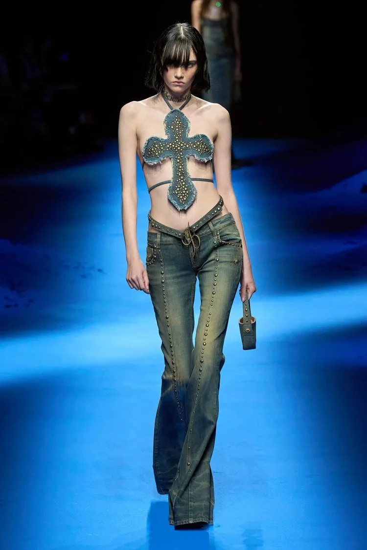 It's time to get serious. I have to admit that themed looks have enormous potential within them. I believe that the beauty of a themed collection starts from the drawing board and whether it goes up or downhill from there is something that each designer and creative team has to keep a crucial eye one. I have to admit something else - Nicola Brognano and the team behind him definitely had that eye out from the very beginning. Brognano brings his idea of what a mermaid is to the light with denim fabrics, scandalous cut outs and the inspiration of early 2000’s fashion that the gen z and younger millennials have been styling these past two years. With the looks given in Bluemarine’s Milan show, I’d say that this is definitely not for the modest person but also has the power to be just that with a few extra layers. The collection’s versatility gives a lot to the table and with the right wearer can be worn in the most unexpected locations and events (coming from a person whose uniform is a miniskirt of course).